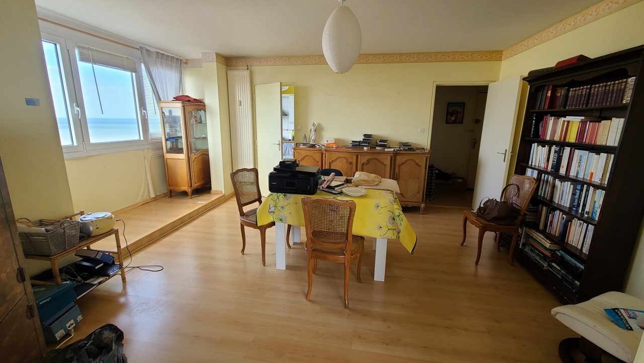 Salon séjour, cuisine équipée, loggia plein ouest vue mer, 3 chambres, placards, cellier/buanderie, salle de bains, wc séparé.
