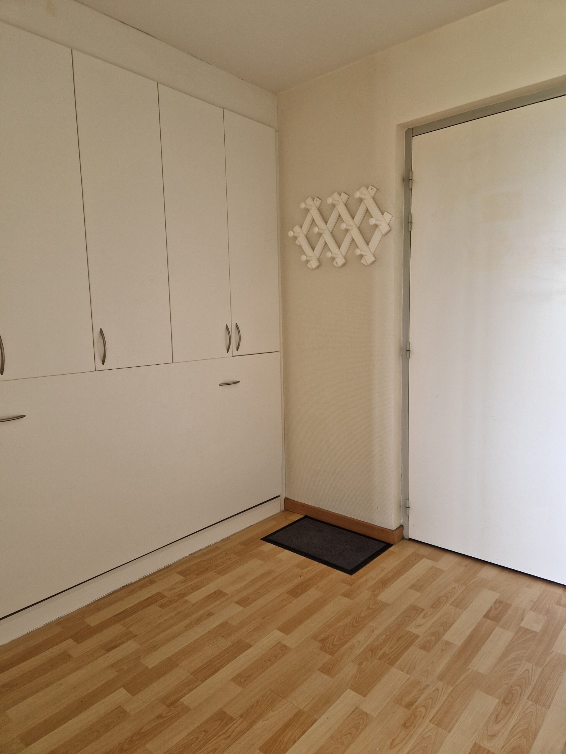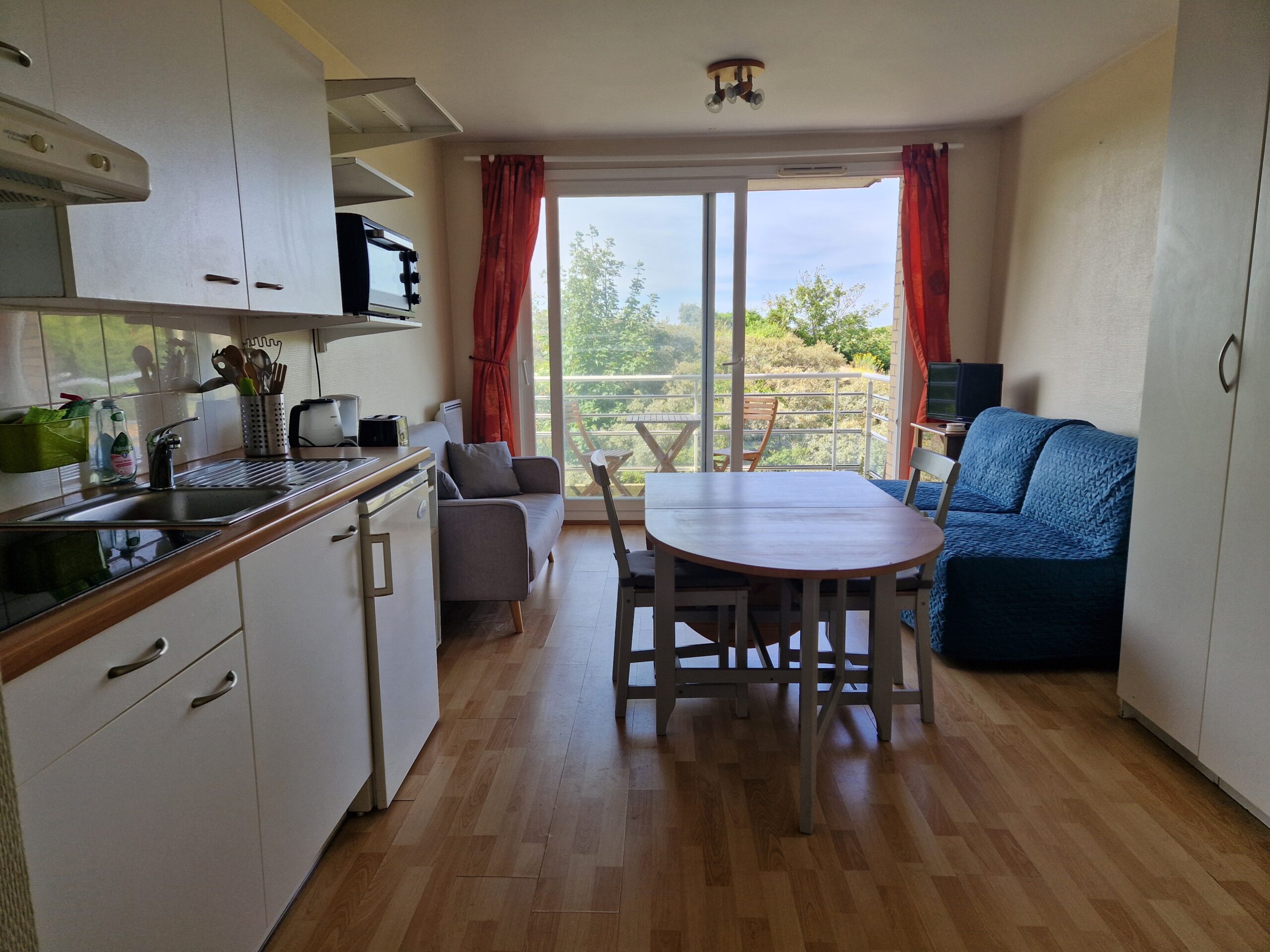 Hall avec placards, séjour VUE MER avec coin cuisine équipée, lit 2 personnes escamotable, salle de bain avec wc, BALCON