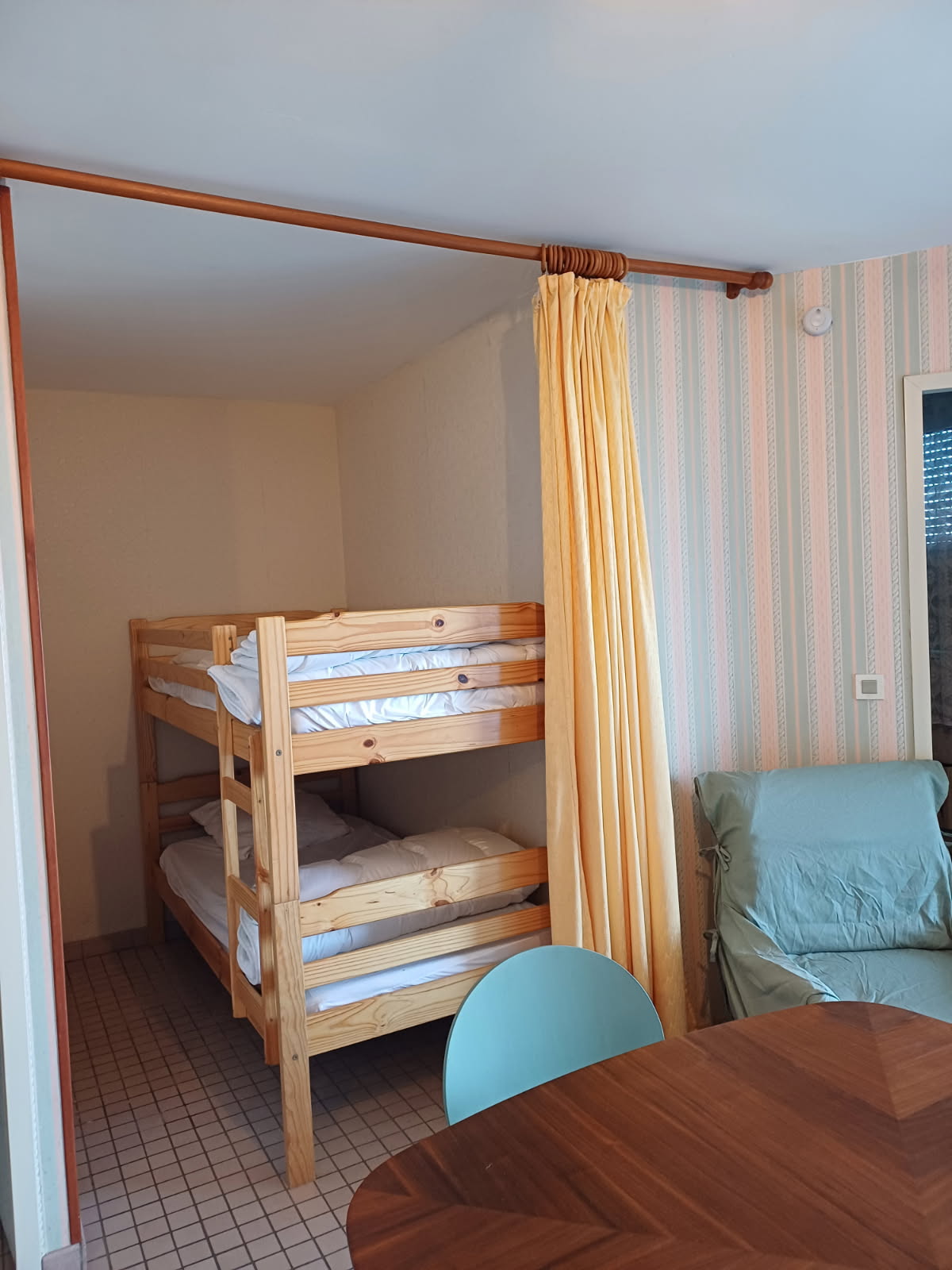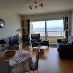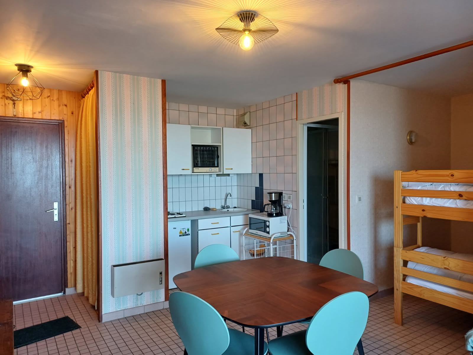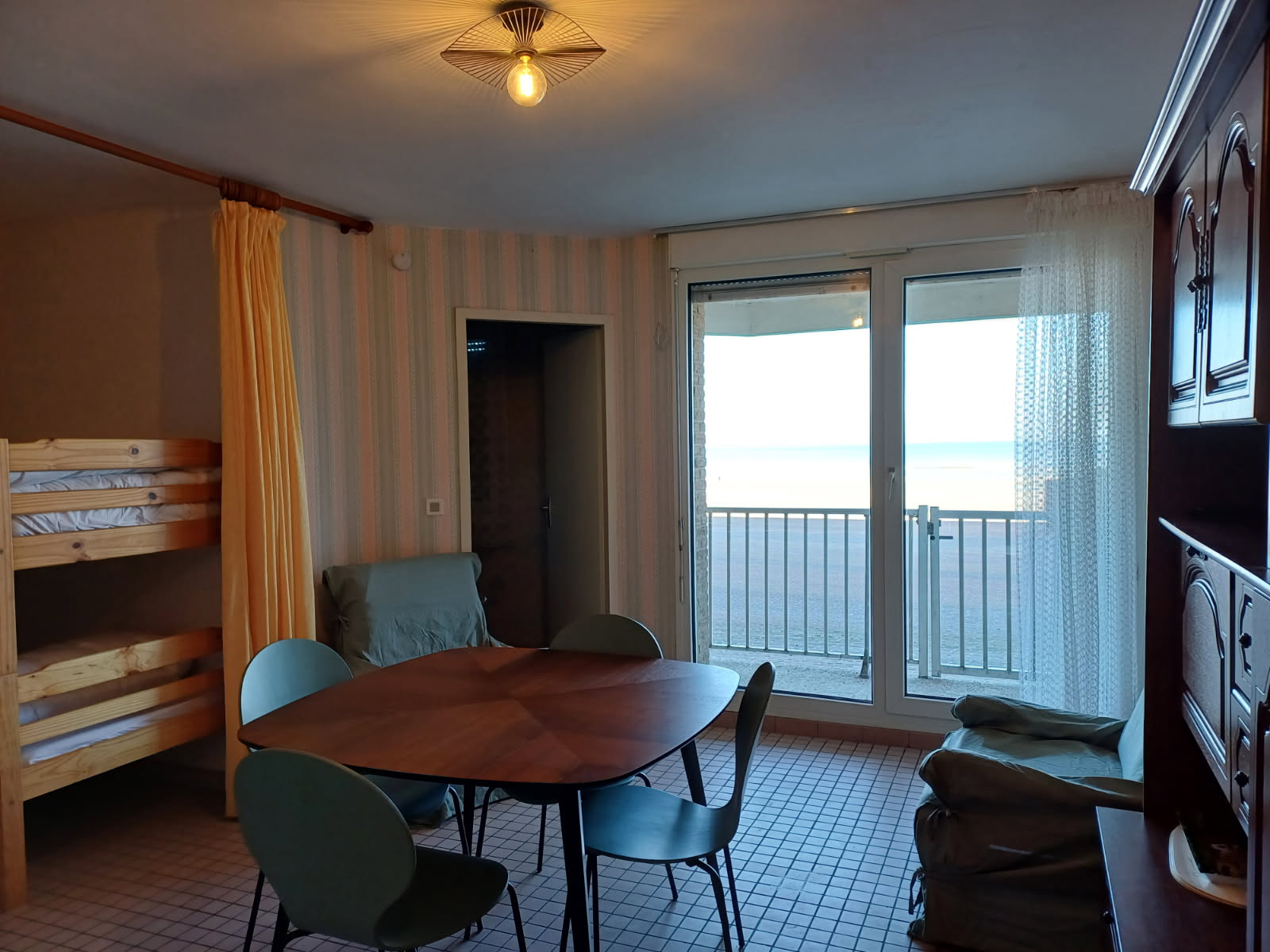 Séjour avec coin kitchenette équipée, (2 lits superposés dans le séjour) , salle de bains avec douche et wc, 1 chambre de 2P face mer