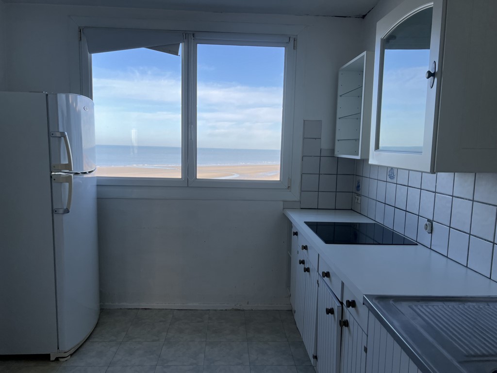 Grand hall avec placards, cellier, salon séjour sur loggia vue mer, cuisine aménagée, wc, 2 chambres, salle de douche.